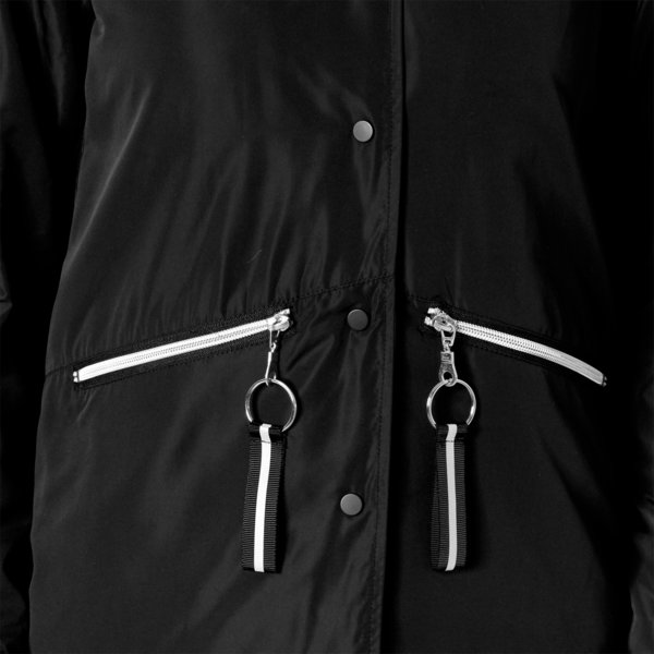 Wyjątkowa kurtka, która łączy w sobie parkę z bomberką. Swobodny fason i wygodne zapinanie na napy gwarantuje pełen komfort. Kieszenie na zamek bezpiecznie przechowają drobiazgi. Klasyczna czerń projektu przypadnie do gustu każdej kobiecie.Materiał: 100% poliesterModelka na zdjęciu ma 174 cm wzrostu i prezentuje produkt w rozmiarze S.